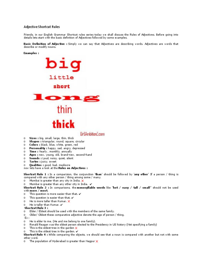 You can sort the descriptive words by uniqueness or commonness using the button above. Adjectives are one of the traditional eight english parts of speech, though linguists today distinguish adjectives from words such as determiners that were formerly considered to be adjectives. The algorithm isn't perfect, but it does a pretty good job for most common nouns. Adjective clauses, or relative clauses, are groups of words that contain a subject and a verb and provide further description. In grammar, an adjective is a word whose main syntactic role is to qualify a noun or noun phrase, giving more information about the object signified.